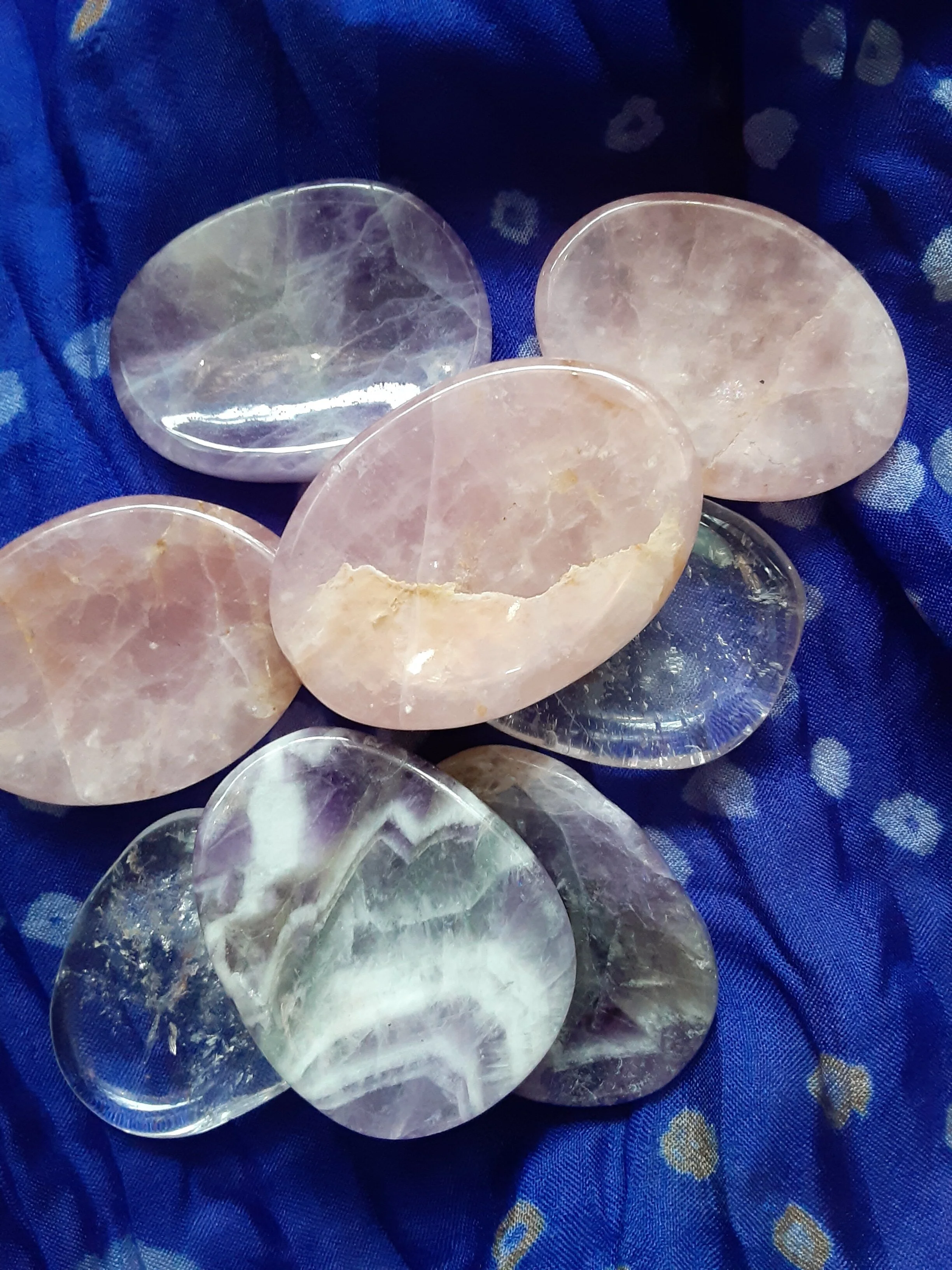 Palm stones serve a purpose similar to worry stones. Holding one, feeling the weight of it, can be soothing. Palm stones are also great to hold while meditating. Palm stones come in many different types of crystals.